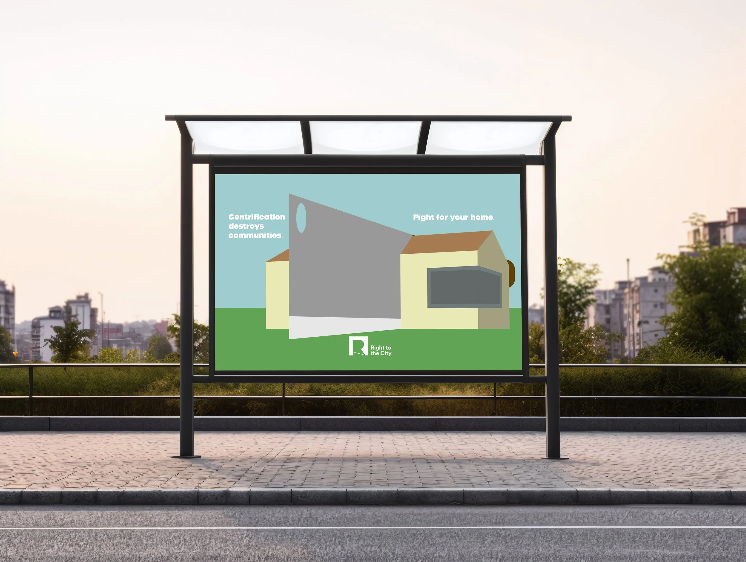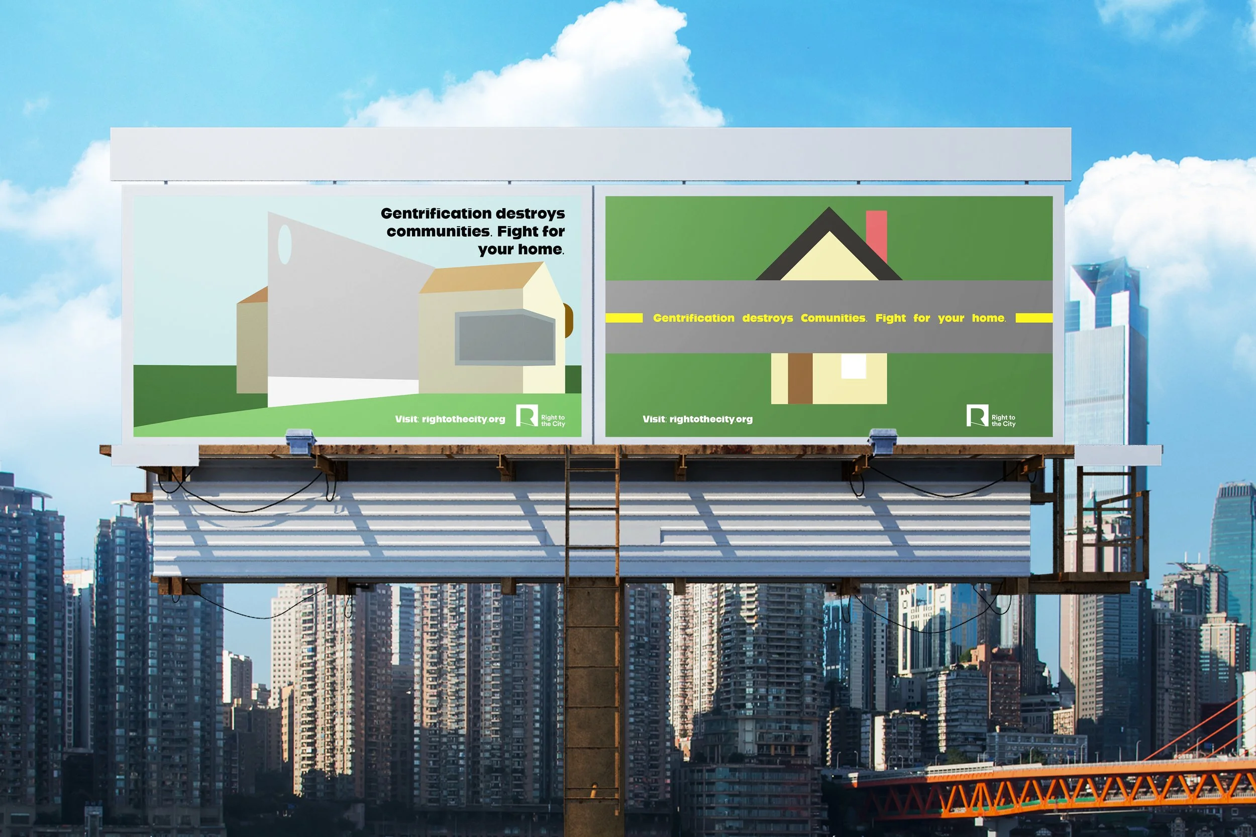 In the third poster, a road overlaps a house to represent new city projects affecting existing residents.